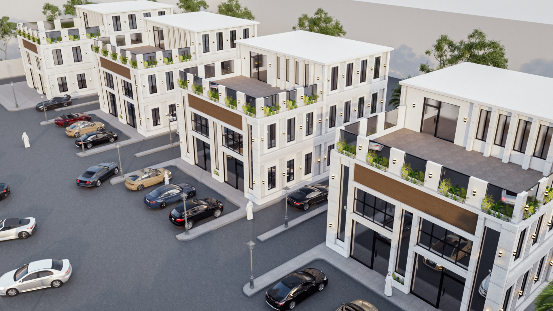 مما يمنح التصميم سلاسة في التنفيذ على مساحة تمتد إلى 4777م2 عبر 4 مباني تجارية متكاملة قابلة للتنفيذ عبر خرسانة مكسوة بمواد حجرية أو صناعية حديثة ، تصلح للإستخدام الإداري، أوالسكني ليصبح ركن غاية الفخامة في الأحياء الحضرية ،
